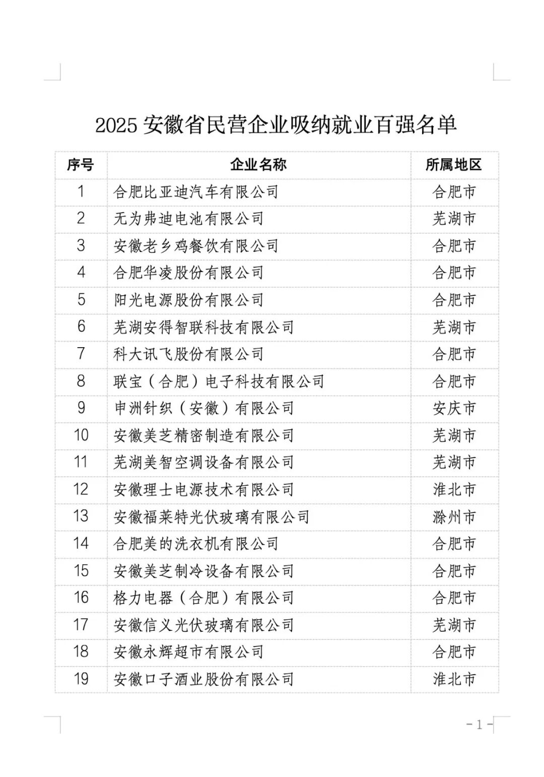 合肥比亚迪汽车有限公司、无为弗迪电池有限公司、安徽老乡鸡餐饮有限公司、合肥华凌股份有限公司、阳光电源股份有限公司位列安徽民营企业吸纳就业百强前五。