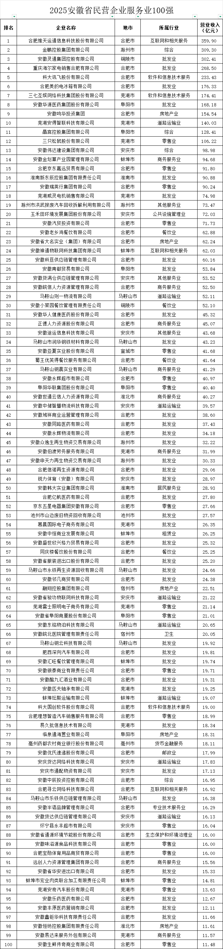 10月16日上午,2025安徽省民营企业百强发布会在合肥举行。会上发布了2025安徽省民营企业“营收百强”“制造业百强”“服务业百强”榜单和“吸纳就业百强”名单。其中: