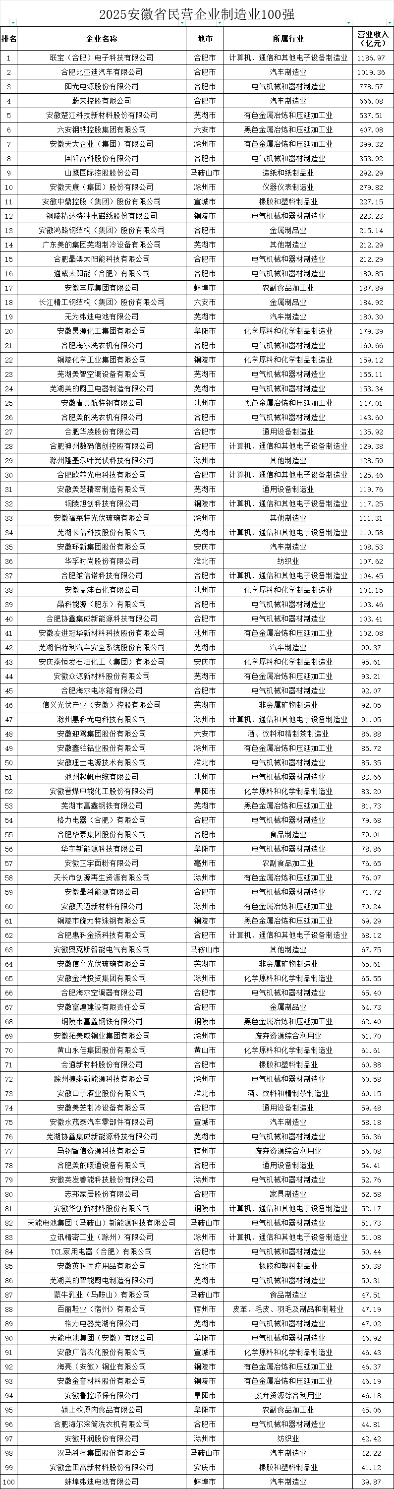 联宝(合肥)电子科技有限公司、合肥比亚迪汽车有限公司、阳光电源股份有限公司、蔚来控股有限公司、安徽楚江科技新材料股份有限公司位列安徽民营企业制造业百强前五。